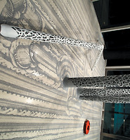 지난 4월 ‘2013 유리상자-아트스타’ 전시에서 보여준 신강호의 나무 조형물들은 다중 투각된 형태를 통해 많은 메시지들을 읽을 수 있었다. 소나무 껍질의 갈라진 모양에서 모티브를 얻었다는 작가는 나무껍질 가장자리로 연결되는 듯한 선들의 형태를 통해 커다란 나무가 지탱하고 성장하는 관계성을 발견하는가 하면 때로는 나무의 생명을 지탱하는 작은 잎맥의 연결선을 통해 경이로운 자연의 생명력을 인지하기도 한다. 거미줄처럼 촘촘하게 짜여진 선들을 통해 지식과 정보, 가상공간의 소통을 꾀하고 있는 현대 디지털 문명이 소나무의 표면에서 느끼는 선적인 요소와 결부되어 마치 새로운 조형요소로 각인되고 있음을 새롭게 발견한 셈이다.